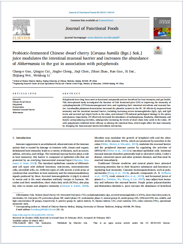 <div><br /> 【引用產(chǎn)品】:<span style="font-size: medium;"><strong><a href="http://www.qabado.com/goods-37601.html"><span style="color: rgb(51, 153, 102);"><u>Mouse IgG ELISA Kit</u></span></a></strong></span></div> <div>&nbsp;</div> <div>【產(chǎn)品貨號】:ml037601</div> <div>&nbsp;</div> <div>【論文標題】:Probiotic-fermented Chinese dwarf cherry [Cerasus humilis (Bge.) Sok.] juice modulates the intestinal mucosal barrier and increases the abundance of Akkermansia in the gut in association with polyphenols</div> <div>&nbsp;</div> <div>【論文網(wǎng)址】:<span style="color: rgb(255, 0, 0);"><strong><a href="https://www.sciencedirect.com/science/article/pii/S1756464621000736"><span style="color: rgb(255, 0, 0);"><u>https://www.sciencedirect.com/science/article/pii/S1756464621000736</u></span></a></strong></span></div> <div>&nbsp;</div> <div>【影響因子】:4.451</div> <div>&nbsp;</div> <div>【反應物種】:Mouse</div> <div>&nbsp;</div> <div>【第一作者】:Chang-e Guo</div> <div>&nbsp;</div> <div>【通信作者】:Weidong Li</div> <div>&nbsp;</div> <div>【發(fā)表時間】:2021-03-23</div> <div>&nbsp;</div> <div>【期 刊】:Journal of Functional Foods</div> <div>&nbsp;</div> <div>【單 位】:北京中醫(yī)藥大學中藥學院</div> <div>&nbsp;</div> <div>【實 驗】:ELISA</div> <div>&nbsp;</div> <div>【組 織】:serum</div> <div>&nbsp;</div> <div>【DOI】:10.1016/j.jff.2021.104424<br /> &nbsp;</div> <div><img src="/images/upload/Image/圖片1(6481).png" alt="" /></div>