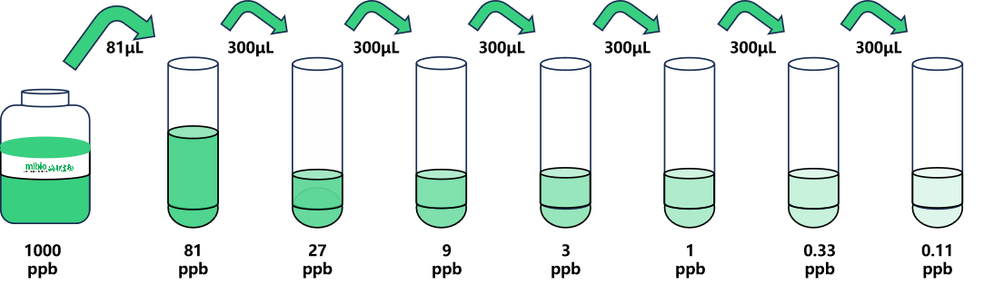 試劑盒中取出標(biāo)準(zhǔn)品,準(zhǔn)備7個試管,先將1000ppb標(biāo)準(zhǔn)品(200µL)按需吸取一定量用1×稀釋液稀釋至81ppb(例:81µL的標(biāo)準(zhǔn)品母液+919µL的1×稀釋液,制備得到1000μL的81ppb濃度標(biāo)準(zhǔn)品),隨后在6個試管中分別加入600μL的1×稀釋液,在這6個單獨的試管中將81ppb標(biāo)準(zhǔn)品依次3倍倍比稀釋至7個梯度,共配制7個濃度的標(biāo)準(zhǔn)品,依次為:81ppb、27ppb、9ppb、3ppb、1ppb、0.33ppb、0.11ppb,從最高濃度標(biāo)準(zhǔn)品溶液中吸取300μL標(biāo)準(zhǔn)品到下一個試管中,輕輕吹打混勻,以此類推進行標(biāo)準(zhǔn)品的倍比稀釋(如圖所示),1×稀釋液用作零濃度標(biāo)準(zhǔn)品(0ppb)。
